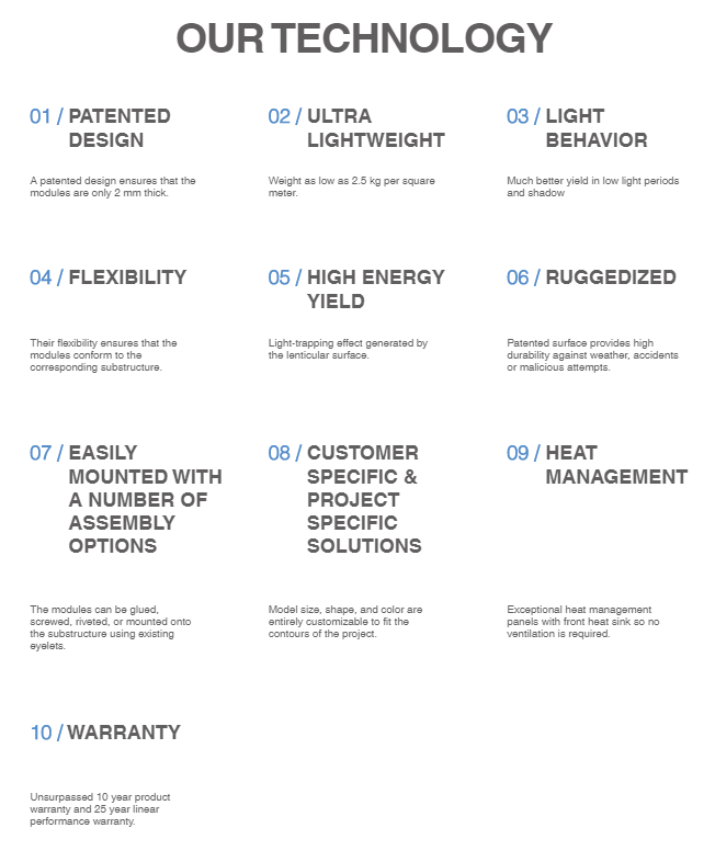 Αποτελούμενο από φωτοβολταϊκές μονάδες που δεν επηρεάζονται ούτε από τη σκόνη, ούτε από άλλους ατμοσφαιρικούς ρύπους ή το χιόνι, με αποτέλεσμα να είναι πάντοτε σε θέση να παράγουν τη μέγιστη ενέργεια. Όντας ευθυγραμμισμένες μεταξύ Ανατολής και Δύσης και κατάλληλα διαμορφωμένες για τις ώρες που δεν έχει πολύ ήλιο, όπως αρκετά νωρίς το πρωί ή αργά το απόγευμα, είναι εξαιρετικά αποτελεσματικές κατά τη διάρκεια του μεσημεριού ή ακόμα και σε συννεφιασμένες καιρικές συνθήκες. Επίσης, χάρη στην πρόσθετη ανεμογεννήτρια που έχουν και με τη βοήθεια ενός μικρής ταχύτητας ανέμου, μπορούν να παράγουν τη μέγιστη ενέργεια, ακόμα και αν δεν υπάρχει καθόλου ηλιακή ακτινοβολία ή είναι μειωμένη. Πρόκειται για ειδικές φωτοβολταϊκές μονάδες χωρίς γυαλί και αλουμίνιο, με «αντικολλητική» επικάλυψη κατά της της ατμοσφαιρικής ρύπανσης, με αποτέλεσμα να συγκαταλέγονται στις καλύτερες λύσεις της αγοράς, όντας αρίστης ποιότητας, μακράς διαρκείας & ιδιαίτερα ελαφριές μονάδες.