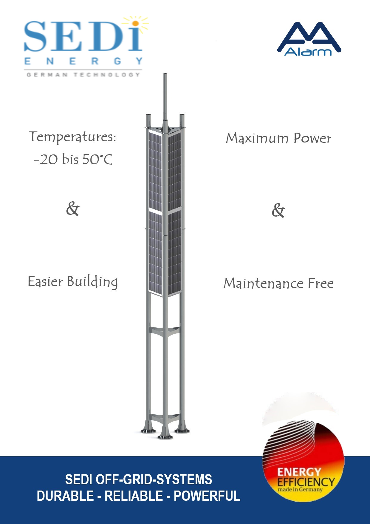 Η AA ALARM είναι αποκλειστικός αντιπρόσωπος της SEDI ENERGY AUSTRALIA στην Ελλάδα, εταιρεία που κατέχει ηγετική θέση στον κλάδο των φωτοβολταϊκών μονάδων & στη βιομηχανία της ασφάλειας σε όλο τον κόσμο. Με αυτή τη συνεργασία, η AA ALARM διασφαλίζει για τους πελάτες της τη μέγιστη αποτελεσματικότητα και την αδιάκοπη λειτουργία των συστημάτων τους, συνδυάζοντας την πολύχρονη εμπειρία της στην εγκατάσταση προηγμένων συστημάτων ασφαλείας και αυτοματισμού με την τεχνογνωσία για τις σύγχρονες τεχνολογίες Ανανεώσιμων Πηγών Ενέργειας.